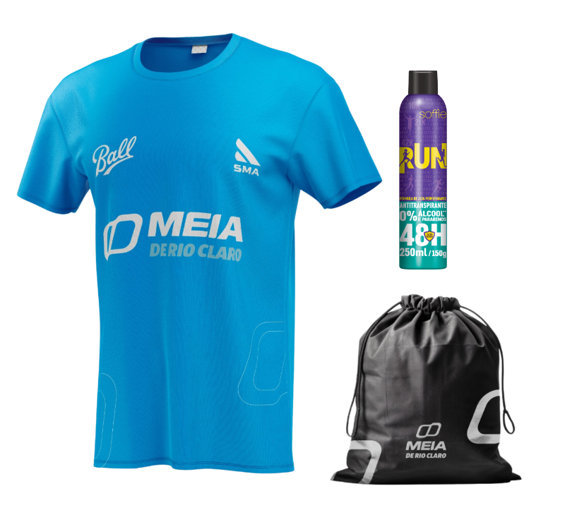 KIT PREMIUM: Camiseta 100% Poliamida Sacola 01 unidade do Desodorante Soffie RUN. Número de peito. Chip.