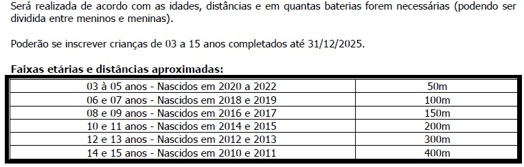 Corrida Kids: percursos de 50 a 400 metros. (Informações específicas no Regulamento do evento).