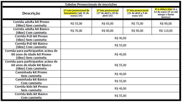O valor da inscrição para corredores acima de 60 anos (conforme o Estatuto do Idoso), atletas PcD, caminhada ou corrida kids, já possuem os 50% descontos, conforme tabela acima.