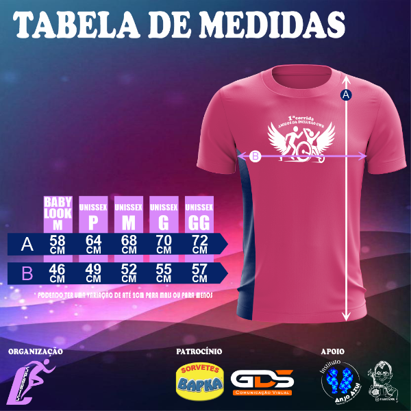 Tamanhos de camisetas Manga Curta rosa ou azul: ADULTO: Baby Look M, Unissex P, M, G e GG.