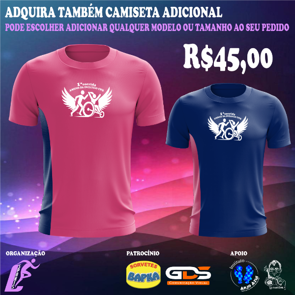 CAMINHADA 2,5KM: R$90,00 + taxa. CAMISETA ADICIONAL Alem do seu kit sendo ele Basic ou Standard você também pode optar por adicionar uma camiseta extra ao seu pedido.